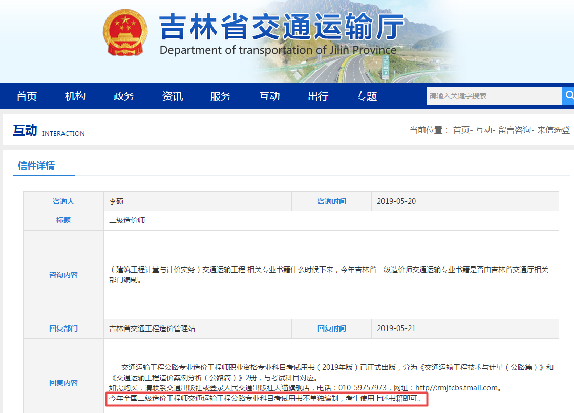 从吉林省交通运输厅问答咨询截图中可以看到,今年全国二级造价工程师交通运输工程公路专业科目考试用书不单独编制,考生使用《交通运输工程技术与计量(公路篇)》和《交通运输工程造价案例分析(公路篇)》2册书籍即可。也就是说,2019年二级造价工程师交通专业教材与一级考试共用教材!