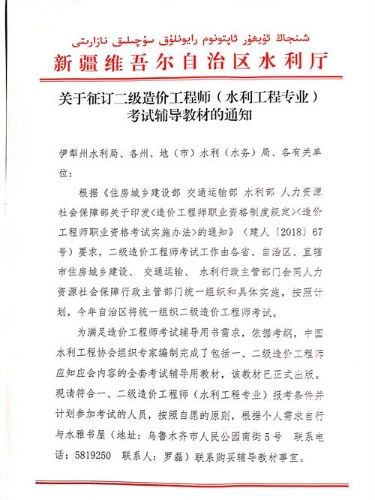 关于征订二级造价工程师(水利工程专业)考试辅导教材的通知