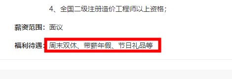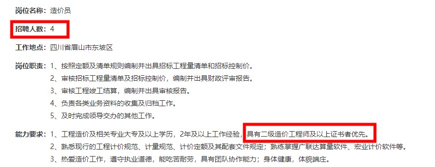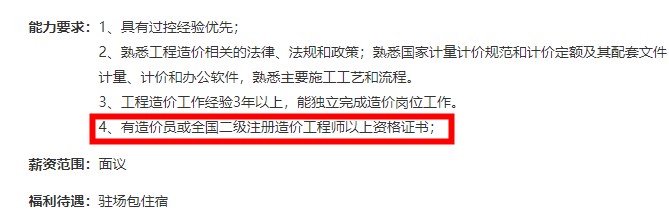 目前各工程建设公司在招聘条件中明确标明,具有二级造价师注册证书优先,且福利待遇都不差。