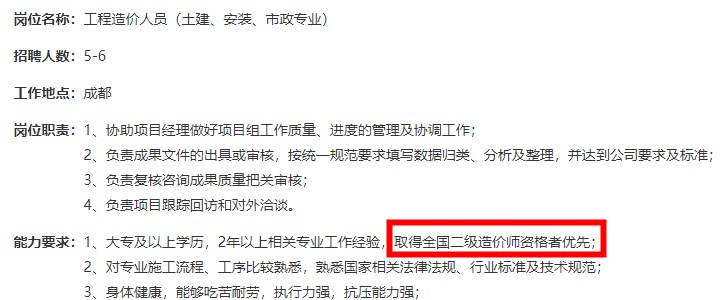 其实大部分工程都是在省内进行,跨省的业务比较少,二级造价师就能满足需求。而且目前大部分企业的招聘条件上都标明有二级造价师证书优先。