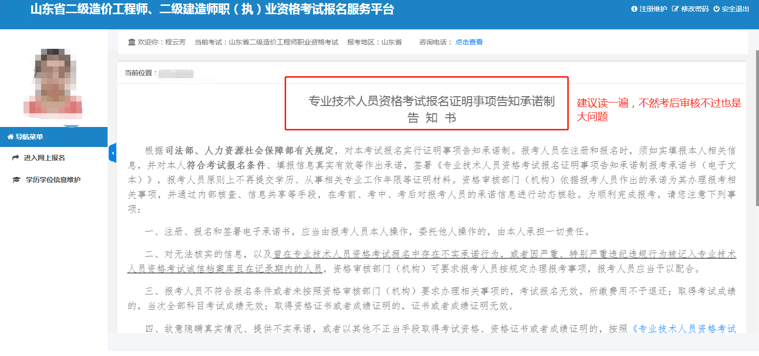 4.阅读考试公告和报名承诺,一定要注意报名承诺制告知书,考前考后审核,一旦出了问题都是你自己负责。
