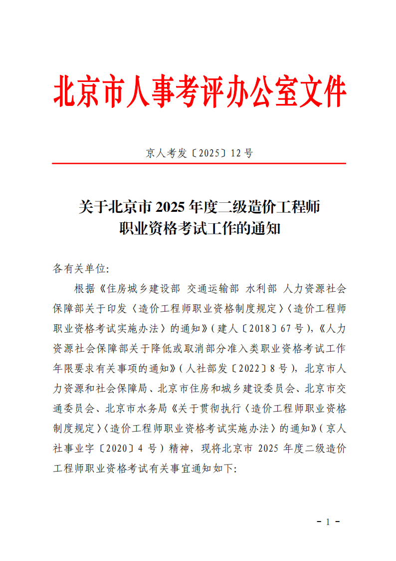 关于北京市2025年度二级造价工程师职业资格考试工作的通知已发布,报考人员须登录北京市人力资源和社会保障局官网 (https://rsj.beijing.gov.cn/,下同)“人事考试服务频道” (以下简称人事考试服务频道),进入“考试报名”栏目,点击 本项考试报名链接进行报名。详细报考通知如下: