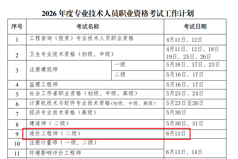 宁夏人事考试中心网站发布2026年二级造价师考试计划,考试时间为:6月13日,具体信息如下: