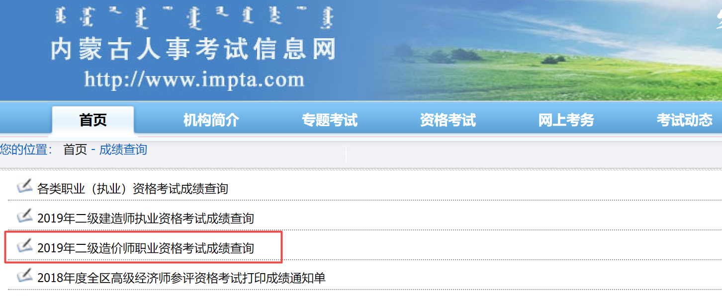 2019年内蒙古二级造价工程师考试成绩查询入口已经开放,内蒙古的考生朋友们,可以登录内蒙古人事考试信息网()查询自己的成绩了,以下是查询流程: