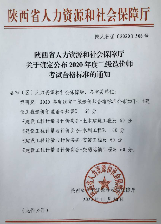 2020年度陕西省二级造价师职业资格考试合格标准已经发布,全部科目合格分数线均为60分。