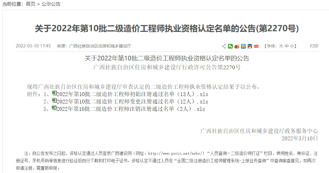关于2022年第10批二级造价工程师执业资格认定名单的公告