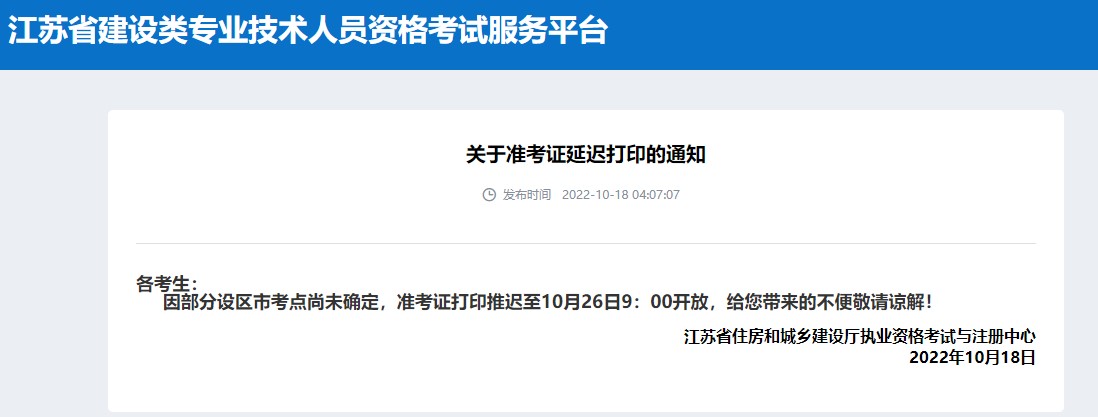 江苏省2022年二级造价师考试准考证打印时间推迟至10月26日,具体通知如下: