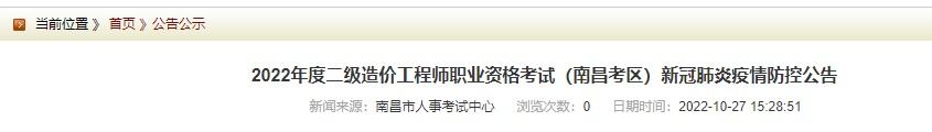 2022年度二级造价工程师职业资格考试(南昌考区)新冠肺炎疫情防控公告
