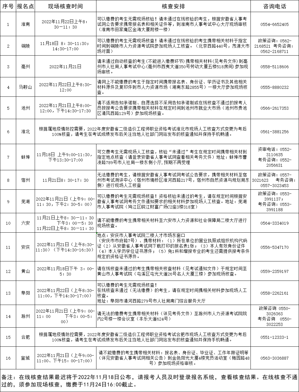 安徽省发布了2022年二级造价师考试现场人工核查安排,涉及16个报考点,时间在11月18日起,请各位考生注意核查时间,带好证明材料,切勿错过。