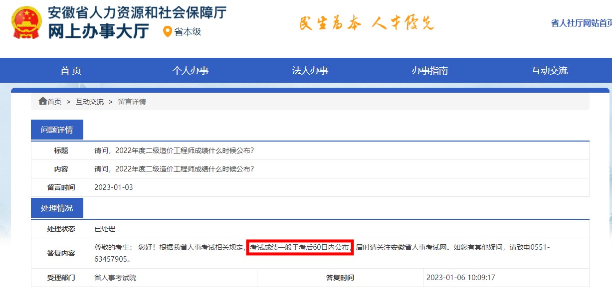 安徽考试院回复:2022年二级造价师考试成绩一般于考后60日内公布
