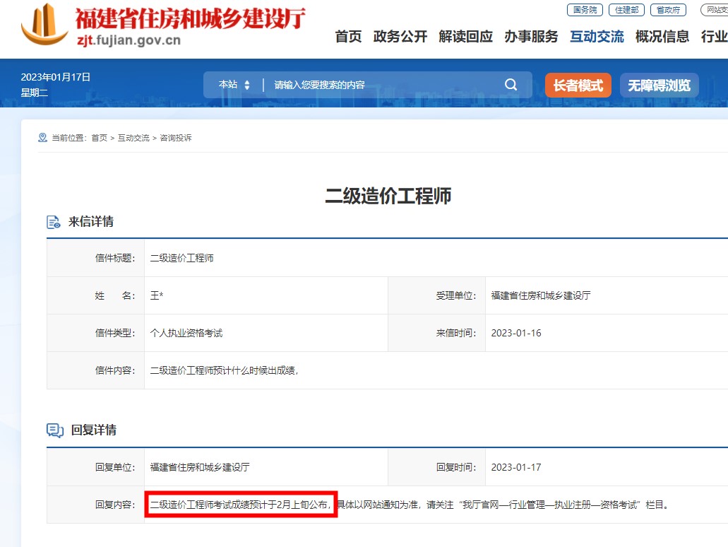 福建省2022年首次进行了二级造价师考试,同学们都很关心考试成绩。近日,有考生就成绩公布时间向福建省住建厅进行提问,并获得了官方回复。