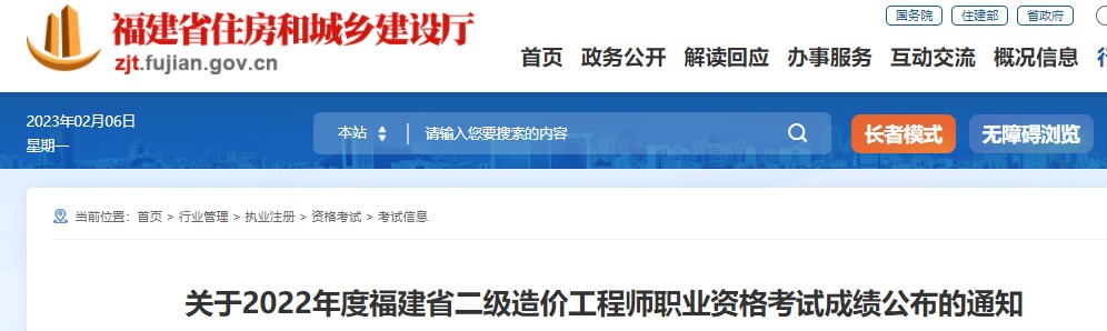 关于2022年度福建省二级造价工程师职业资格考试成绩公布的通知
