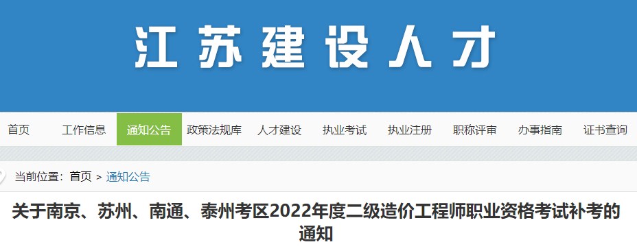 关于南京、苏州、南通、泰州考区2022年度二级造价工程师职业资格考试补考的通知