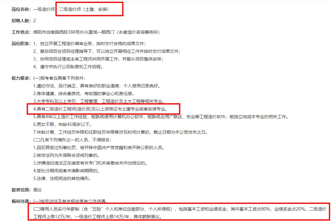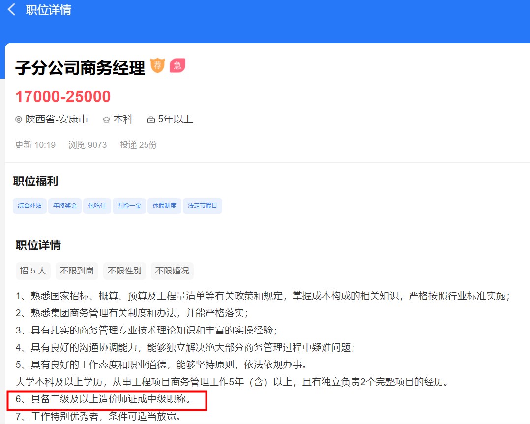 二造证书还是迈入行业的门槛,各大公司招聘要求都标明拥有二级造价师证书优先!