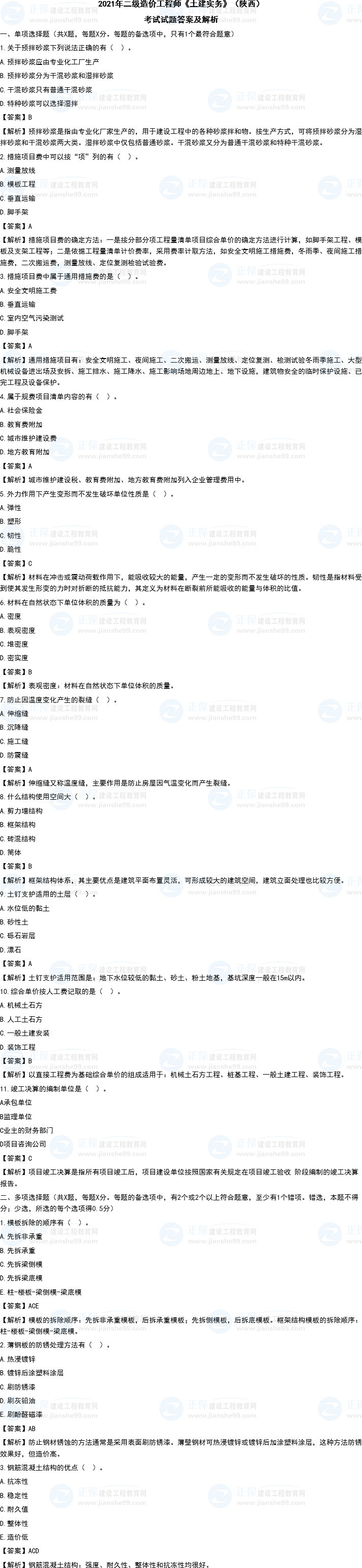 陕西2021年二级造价师考试《土建实务》考试试题及答案解析(考生回忆版)
