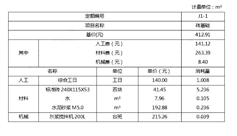 某传达室砖基础,墙体厚度240mm,采用MU100标准砖(240×115×53),M5水泥砂浆砌筑。已知:砖基础1.00m3,企业管理费费率为15%,利润率为11%,人工单价按照当地造价管理部门发布的人工市场价格信息调整为154元/工日(本题机械费中的人工费不作调整),标准砖(240x115X53)市场价格信息为600元/千块。