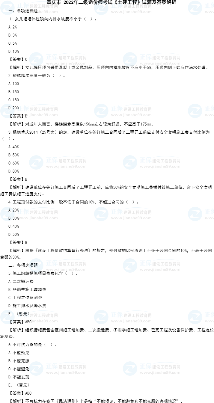 重庆市 2022年二级造价师考试《土建工程》试题及答案解析(部分)