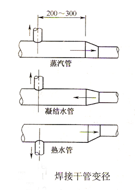 干管变径时,采用偏心变径管。立管位置距变径处200~300mm。
