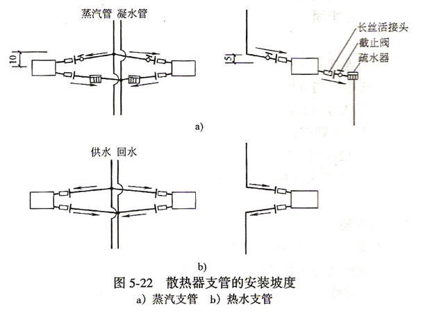 4.水平管道坡度 热水采暖及汽水同向的蒸汽和凝结水管,坡度一般为3‰ 。