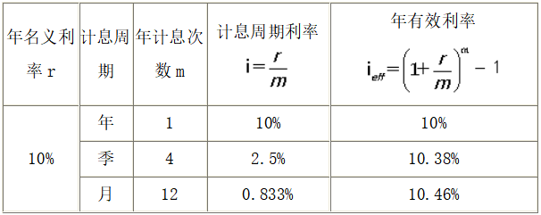 现设年名义利率为10%,则按年、季、月计息的年有效利率见下表。