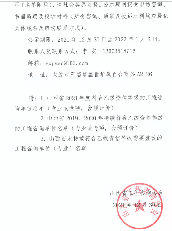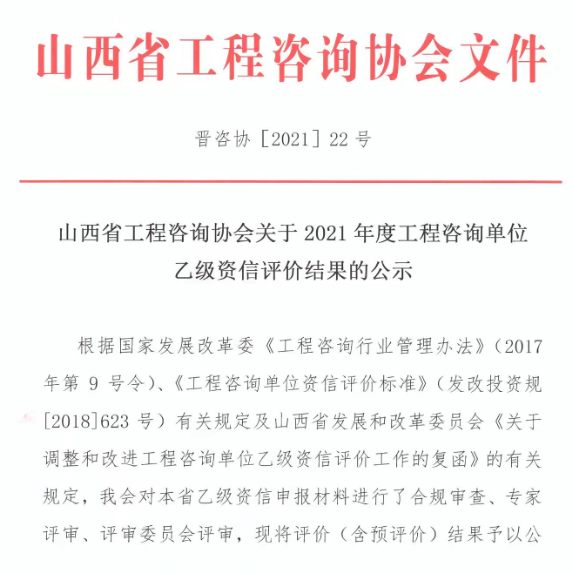 山西工程咨询协会关于2021年度工程咨询单位乙级资信评价结果的公示
