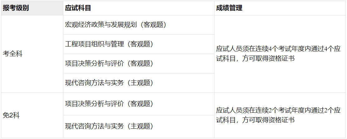 上述人员可免试部分科目,只参加《项目决策分析与评价》和《现代咨询方法与实务》2个科目的考试。