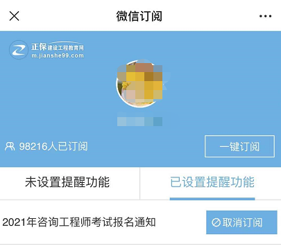 当2021年咨询工程师考试报名信息公布时,我们会马上微信提醒您,再也不用天天刷人事网了!赶快订阅吧!