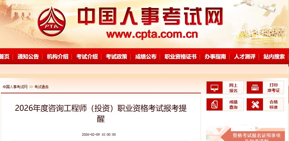 中国人事考试网发布2026年度咨询工程师(投资)职业资格考试报考提醒,报名时间确定为:2月25日至3月11日,具体信息如下: