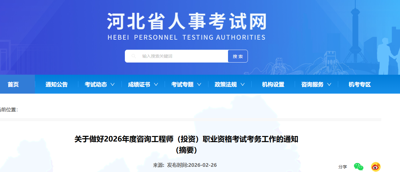 河北省人事考试网发布关于做好2026年度咨询工程师(投资)职业资格考试考务工作的通知(摘要),具体信息如下: