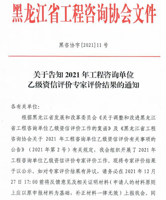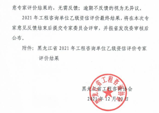 黑龙江关于告知2021年工程咨询单位乙级资信评价专家评价结果的通知