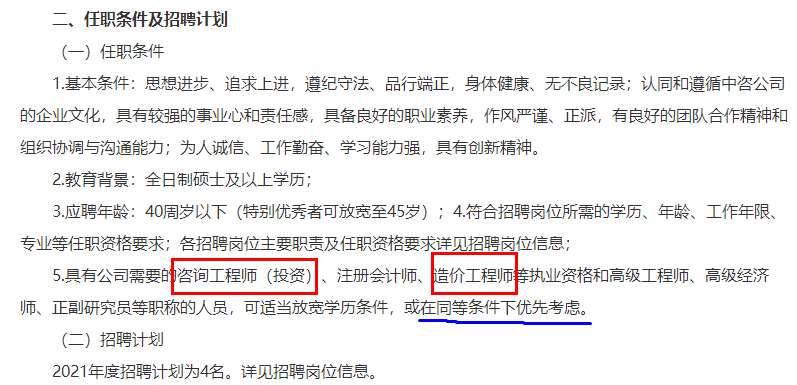 招聘信息中明确说明了具有咨询工程师、造价工程师等证书的会适当放宽学历条件及优先考虑。足以说明有个证书的重要性,所以大家也不要老是质疑咨询、造价等证书的含金量,趁年轻,多学习,多考证。
