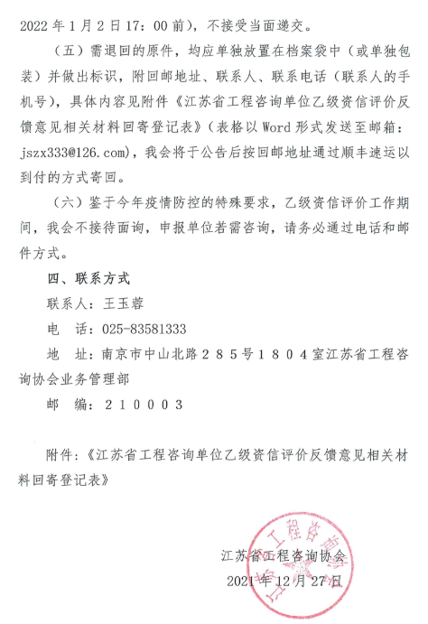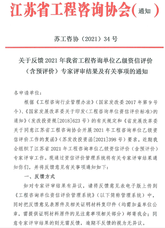 关于反馈2021年江苏工程咨询单位乙级资信评价(含预评价)专家评审结果及有关事项的通知