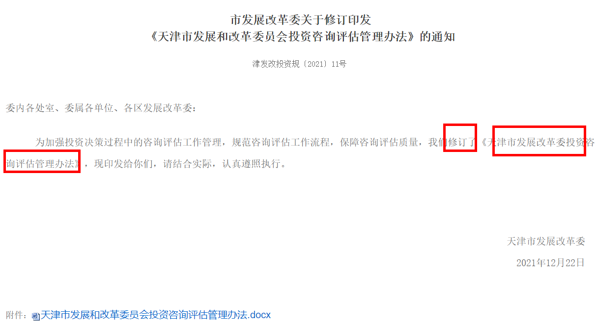 为加强投资决策过程中的咨询评估工作管理,规范咨询评估工作流程,保障咨询评估质量,我们修订了《天津市发展改革委投资咨询评估管理办法》,现印发给你们,请结合实际,认真遵照执行。
