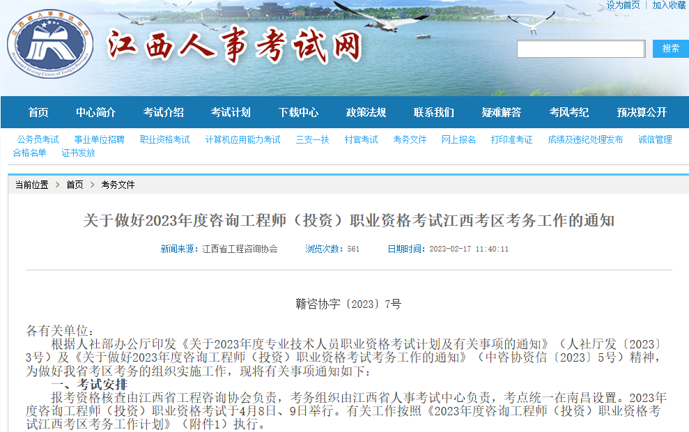 报考资格核查由江西省工程咨询协会负责,考务组织由江西省人事考试中心负责,考点统一在南昌设置。2023年度咨询工程师(投资)职业资格考试于4月8日、9日举行。有关工作按照《2023年度咨询工程师(投资)职业资格考试江西考区考务工作计划》(附件1)执行。