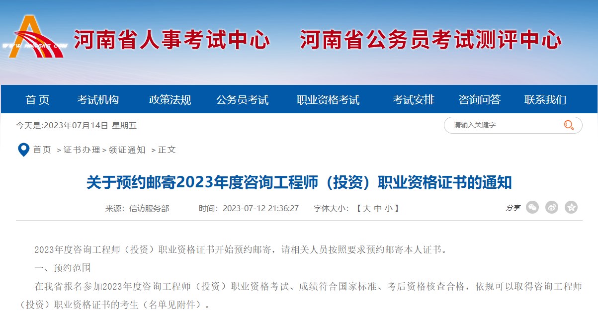 河南省人事考试中心发布《关于预约邮寄2023年度咨询工程师(投资)职业资格证书的通知》,预约期为2023年7月13日至8月4日,逾期不申请,不再受理邮寄申请,详情如下: